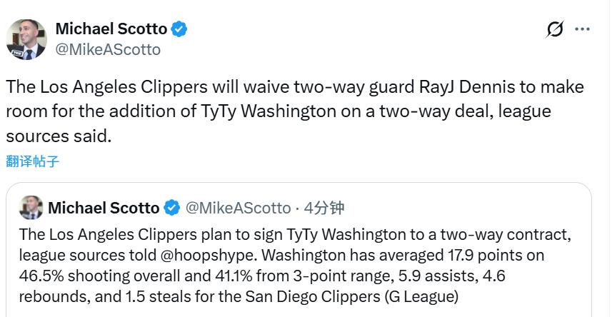 快船完成一笔签约和一笔裁员!通过双向合同引进了火箭前球员华盛顿,他曾在G联赛中单场砍下53分。
