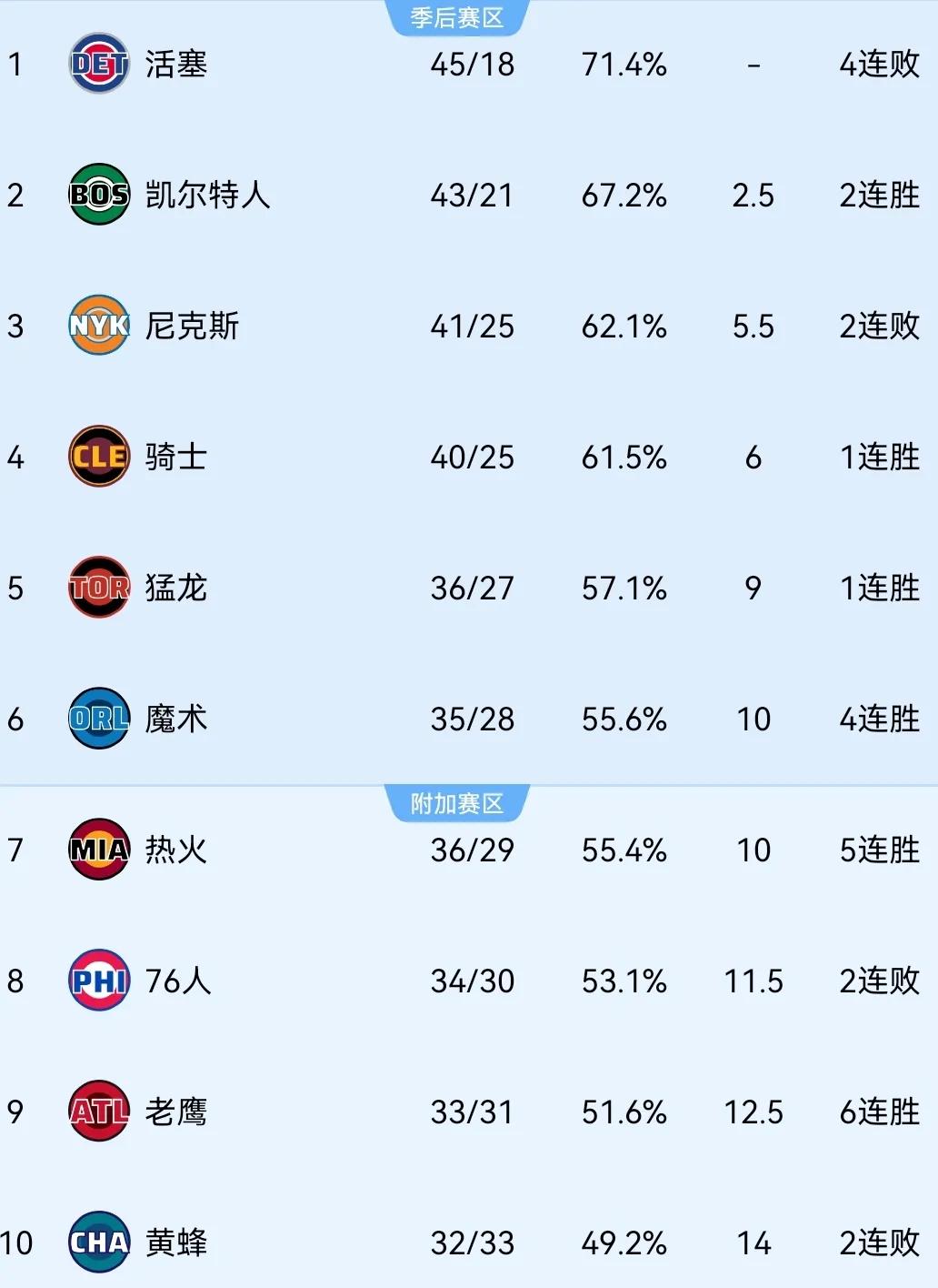 本赛季至今,热火队取得36胜29负战绩,位列东部第七,已追平第六名魔术队(35胜28负)的胜场数,且仅落后第五名猛龙队(36胜27负)1个胜场,很有希望直接锁定一个季后赛席位。