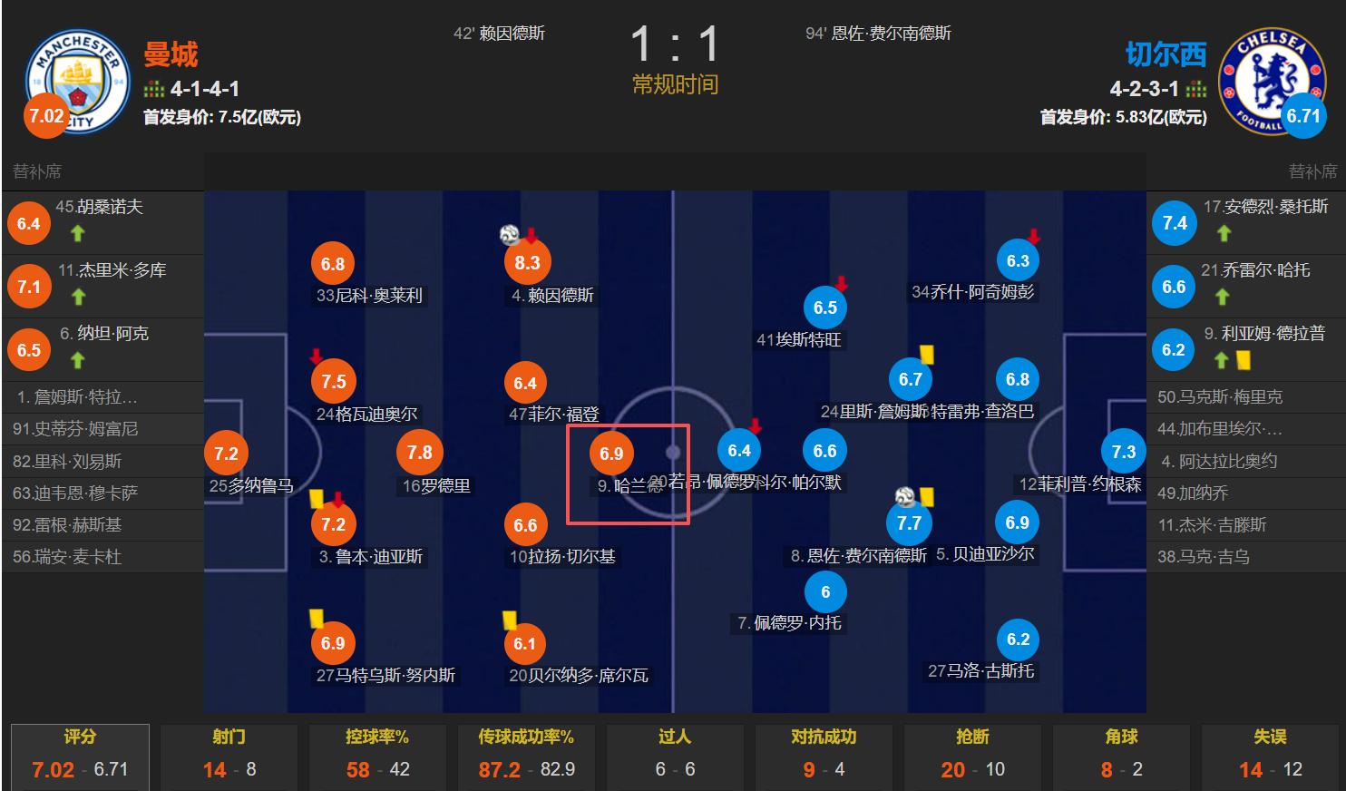 曼城1-1战平切尔西,哈兰德首发出场并踢满全场,但未能取得进球,赛后评分为6.9分。