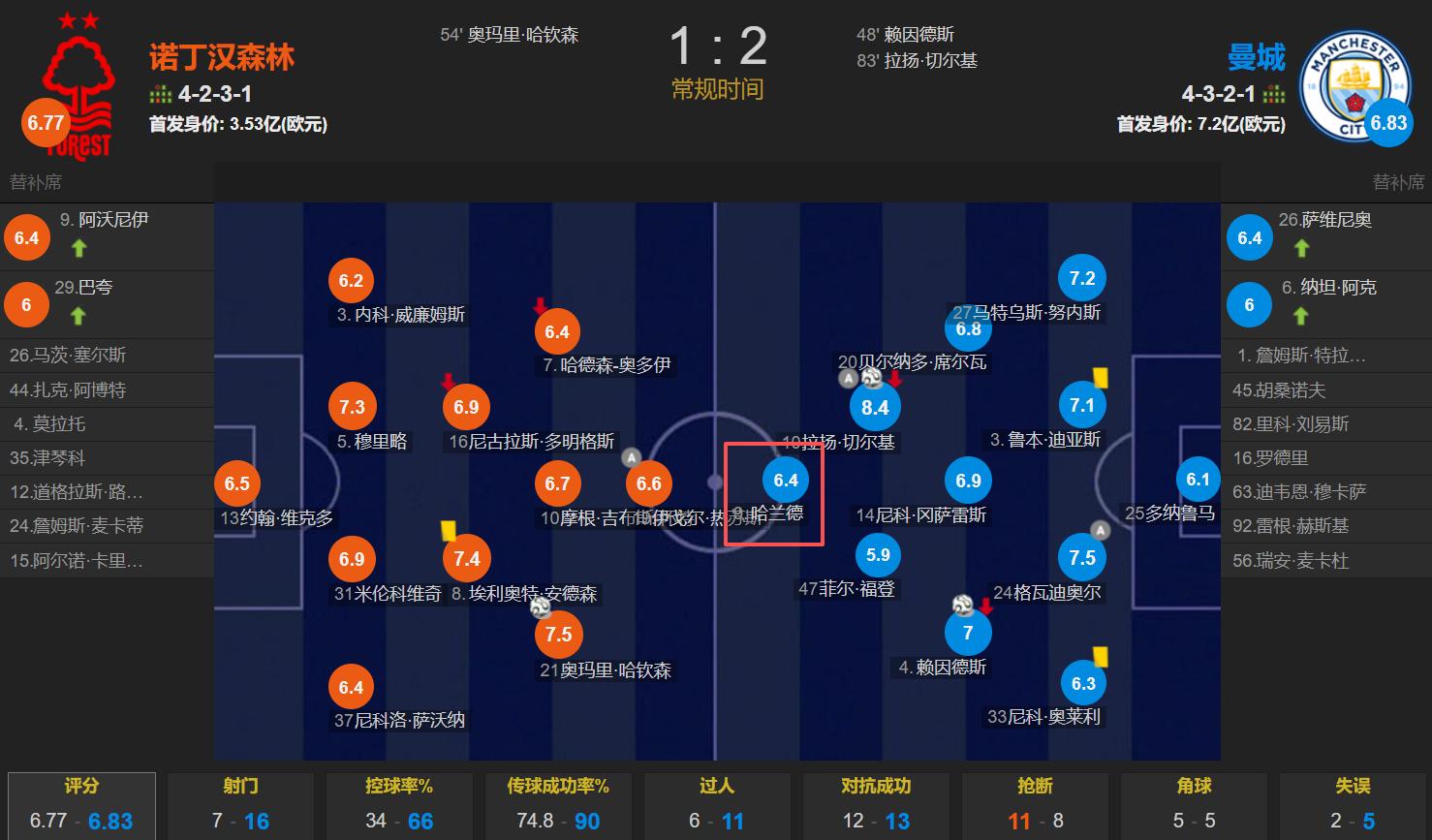 曼城2-1险胜诺丁汉森林,哈兰德首发并踢满全场,依然未能进球,赛后评分为6.4分。