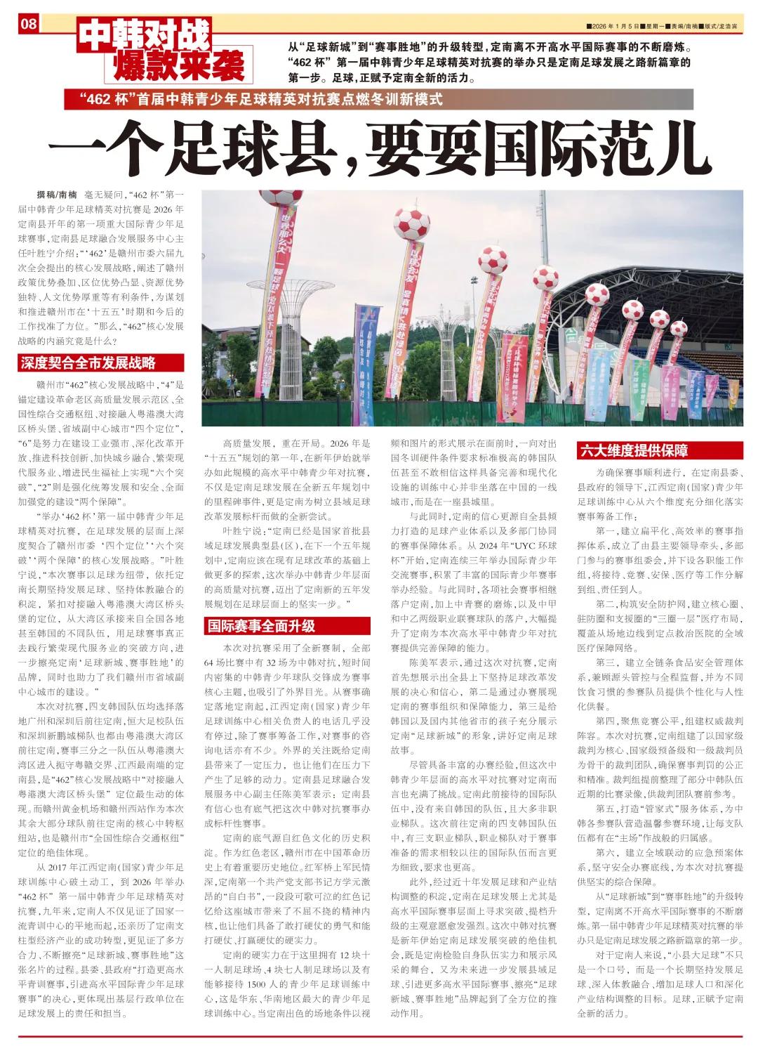 撰稿/南楠 毫无疑问,“462杯”首届中韩青少年足球精英对抗赛是2026年定南县新年伊始举办的首个重大国际青少年足球赛事,定南县足球融合发展服务中心主任叶胜宁表示:“‘462’是赣州市委第六届九次全会提出的核心发展战略,阐述了赣州在政策优势叠加、区位优势明显、资源优势独特及人文优势深厚等方面的有利条件,为赣州市‘十五五’期间及未来工作的规划和推进指明了方向。”那么,“462”核心发展战略具体包含哪些内容呢?