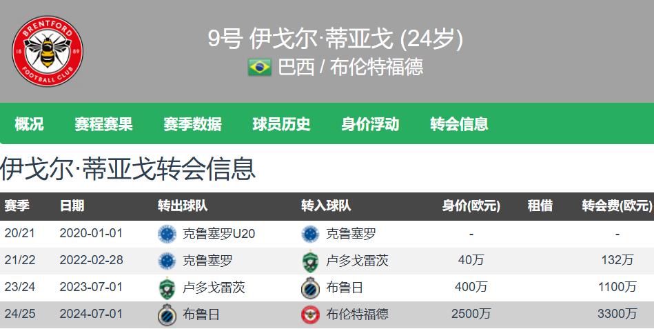 伊戈尔-蒂亚戈于2024年夏季转会窗口以3300万欧元身价从布鲁日加盟布伦特福德,自姆伯莫被曼联高价引进后,伊戈尔-蒂亚戈已成为布伦特福德的新核心锋线,带领球队攻城略地,效率极高。