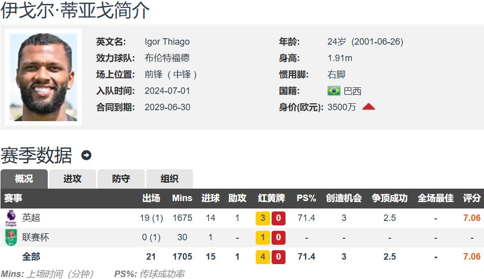 现年24岁的伊戈尔-蒂亚戈,身高1.91米,惯用右脚,司职中锋,是一名巴西球员,与布伦特福德的合同有效期至2029年,德转估值为3500万欧元。本赛季他参加了全部20场英超比赛,其中19次首发,攻入14球。