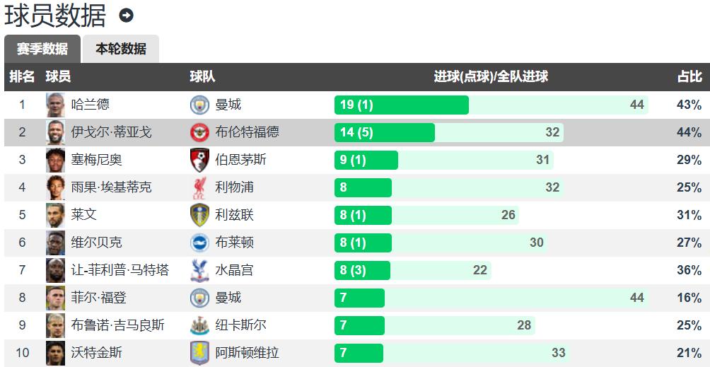 英超射手榜上,哈兰德以19球(含1个点球)领跑,伊戈尔-蒂亚戈以14球(含5个点球)位列第二,他俩是本赛季英超唯二进球达到两位数的球员。