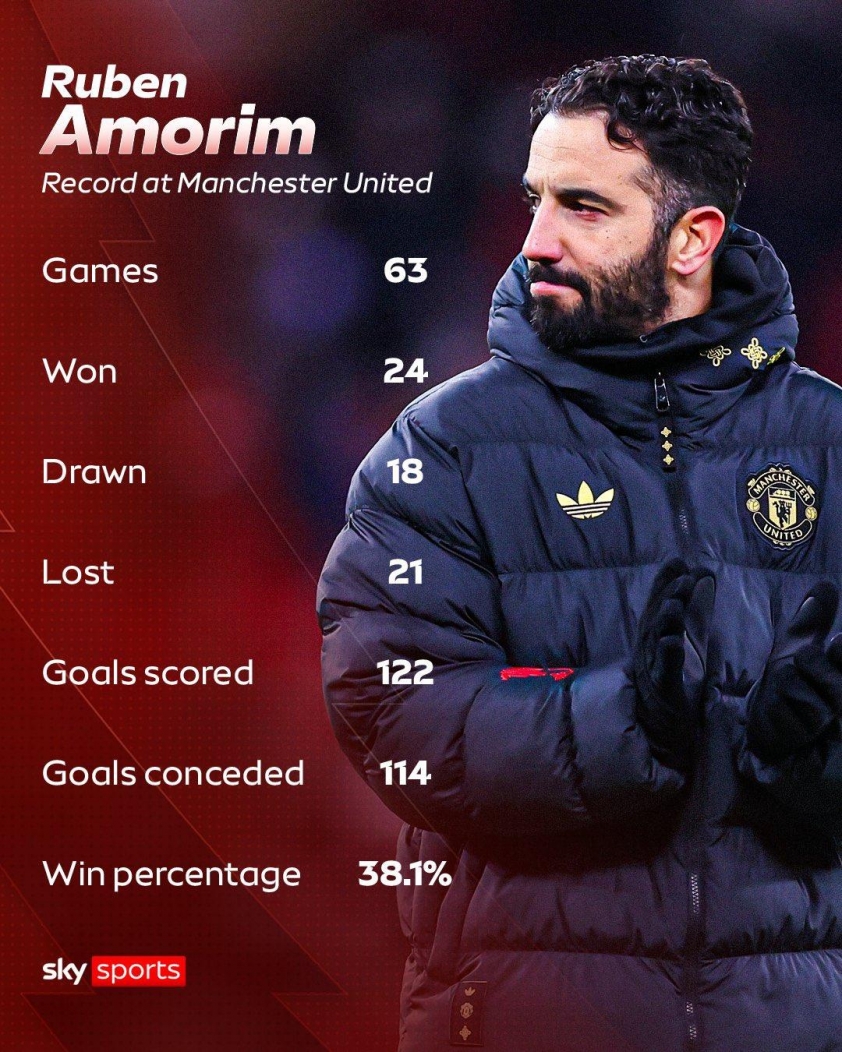 在所有比赛中,阿莫林仅赢得了 38.1%的比赛 (63场比赛中仅获24胜),这是自弗格森爵士退休以来曼联主帅中最差的战绩,除朗尼克外,他在担任临时主帅的6个月里胜率为37.9%。