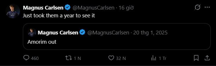 早在去年,卡尔森就在曼联主场以1-3败给布莱顿后公开呼吁俱乐部解雇阿莫林,当时这位挪威国际象棋大师 表达了他的失望,用“Amorim Out”的信息传达了他的不满,显示出他对所支持球队糟糕表现的极大不耐烦。 “他们花了一整年才发现问题所在。”——卡尔森在个人主页上如此写道。
