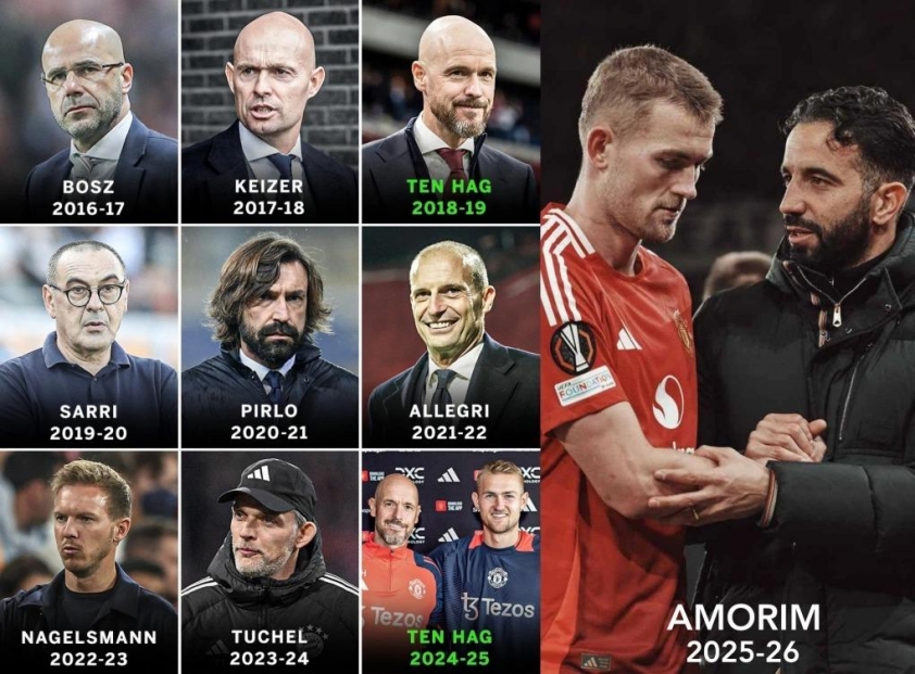 而阿莫林则是德利赫特最新的“教练受害者”。 这位葡萄牙教练 是德利赫特10个职业赛季里执教他的第10位主教练。