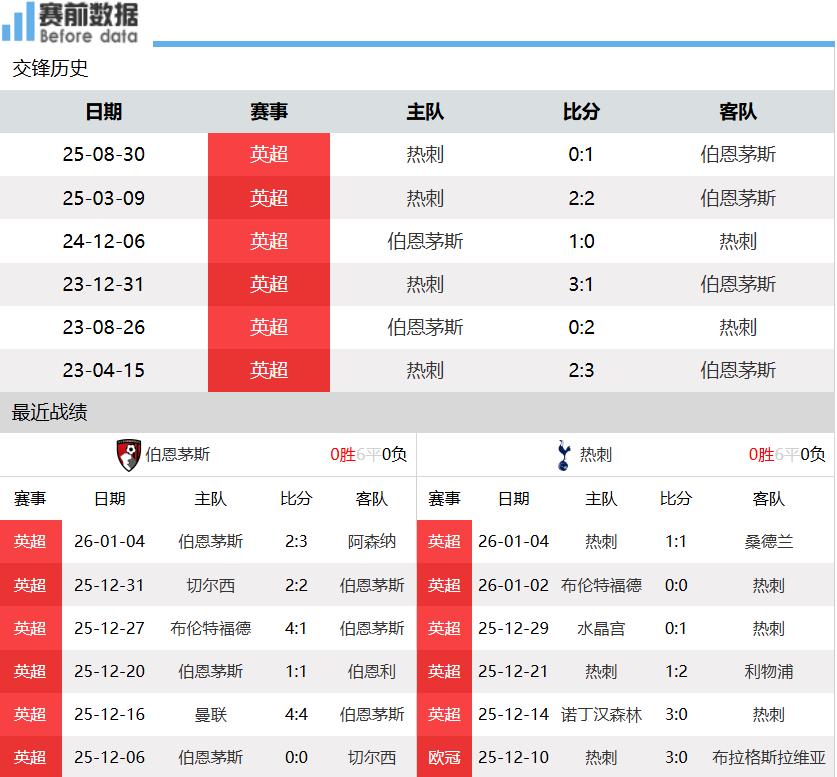 北京时间1月8日凌晨03:30,英超第21轮,伯恩茅斯将在主场迎战热刺。