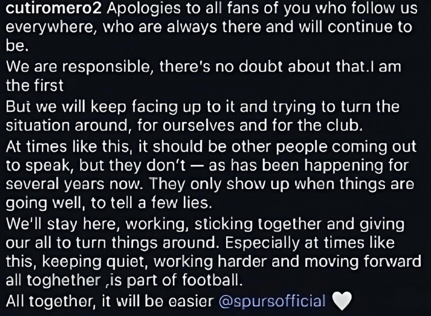 “真心向一直支持我们的球迷们道歉,感谢你们无论何时都在背后支持球队。全体球员都应为这糟糕的成绩负责。但我们也会努力扭转局面,不仅是为了自己,也是为了俱乐部。在这种时刻,应该有其他人站出来发声,但他们却选择沉默,这种情况已经持续了好几年。他们只在局势看似良好时出现,随口说些谎言。我们依然会留在这里,齐心协力,尽最大努力改善俱乐部的现状。保持沉默,努力奉献,朝着美好未来前进,这是我们必须做的。只要团结一心,一切都会好转。”— 罗梅罗在个人主页上写道。
