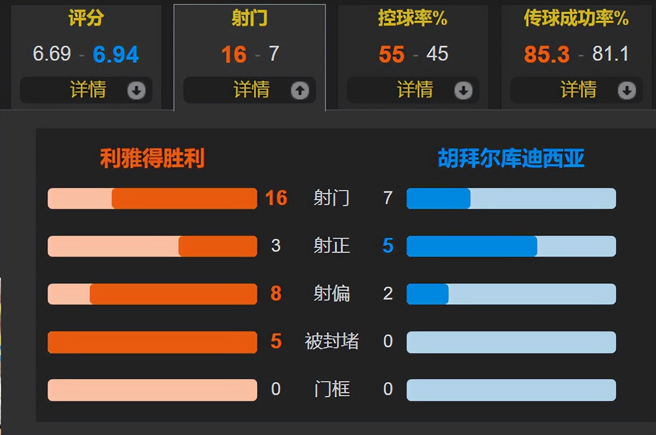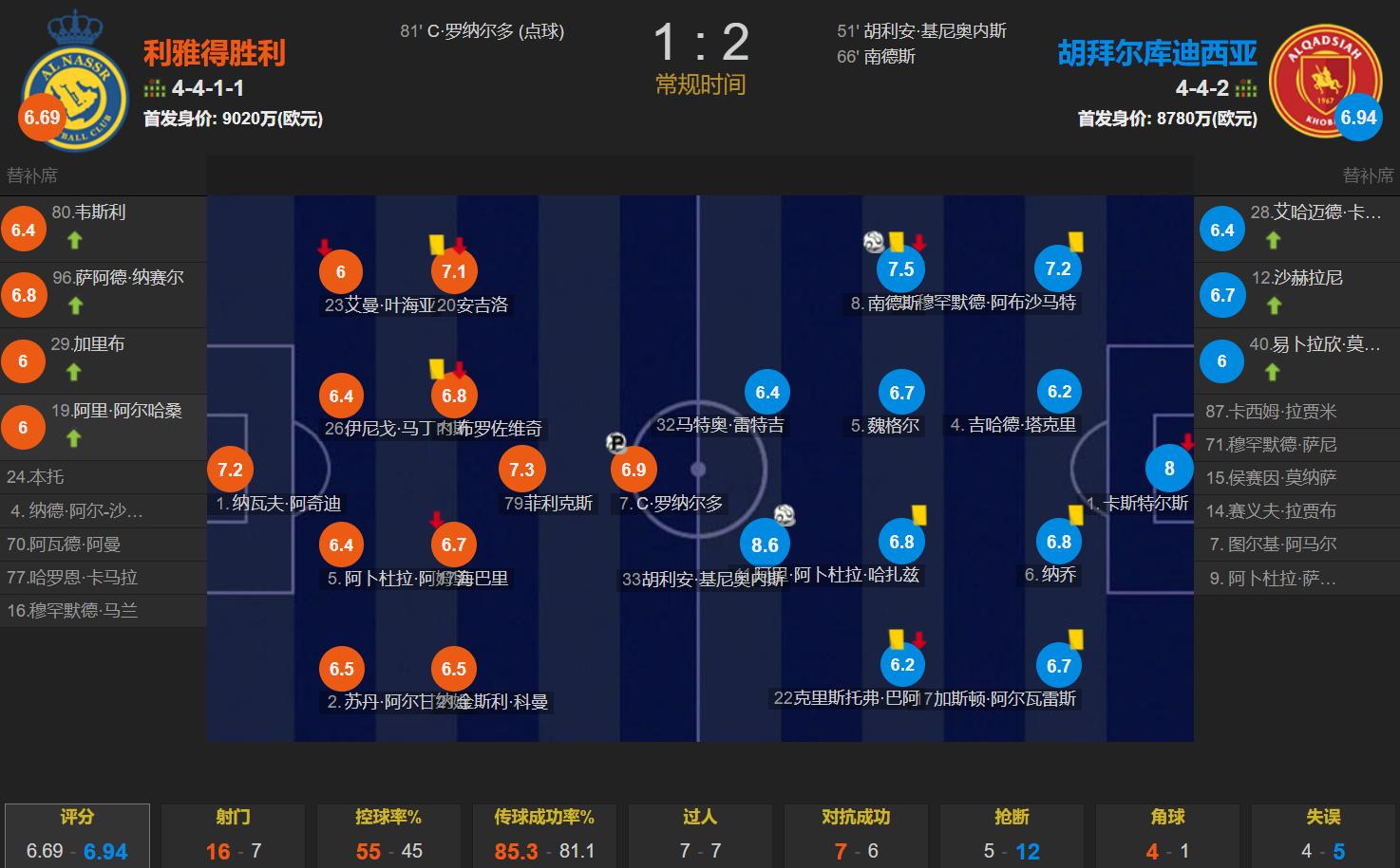 本场比赛,利雅得胜利在主场掌控场面,但未能转化为得分。球队控球率55%,共计16次射门,是胡拜尔库迪西亚7次的两倍多,但仅有3次射正,反而比对方的5次射正少,显示进攻效率极低。C罗全场射门次数最多,5次射门仅有一次点球射正,赛后评分仅6.9分,点球进球避免了更低评分。C罗正一步步迈向“千球伟业”,但利雅得胜利近三轮沙特超级联赛丢了8分,被利雅得新月超越4分,如果下轮客战新月未能取胜,C罗加盟利雅得胜利的第四个赛季将再次面临联赛冠军失落、至今零冠的尴尬局面!