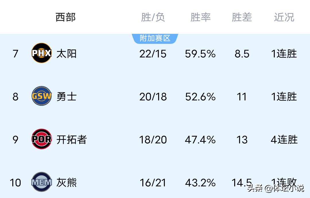 北京时间1月8日,NBA常规赛继续展开,昨天多场比赛结束,掘金114-110力克东部劲旅凯尔特人,战绩不佳的鹈鹕100-117输给老鹰,快船111-123败给尼克斯,太阳全力出击117-98大胜灰熊,爵士加时以125-129惜败卫冕冠军雷霆,詹姆斯缺席的湖人91-107惨遭马刺击败,雄鹿113-120不敌勇士,火箭爆冷以102-103输给开拓者。由此,西部最新排名出炉:雷霆居首,马刺第二,掘金第三,湖人第四,火箭排第六,开拓者第九!