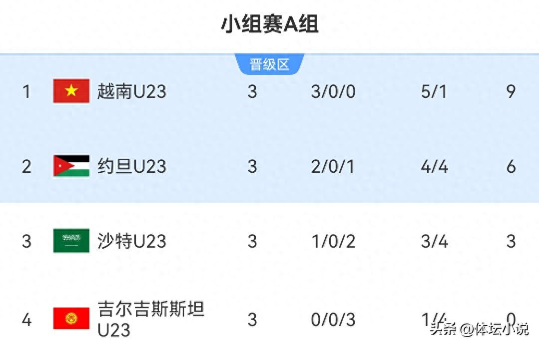 北京时间1月13日,U23亚洲杯小组赛第三轮比赛打响,凌晨两场比赛落幕。约旦以1-0战胜吉尔吉斯斯坦,收获两连胜;东道主沙特0-1负于越南,遭遇第二场败绩。最新积分榜显示,越南三战全胜,稳居小组头名晋级八强,约旦则凭借两连胜排名第二同样晋级,沙特两败出局,吉尔吉斯斯坦三战皆负垫底,无缘继续比赛!