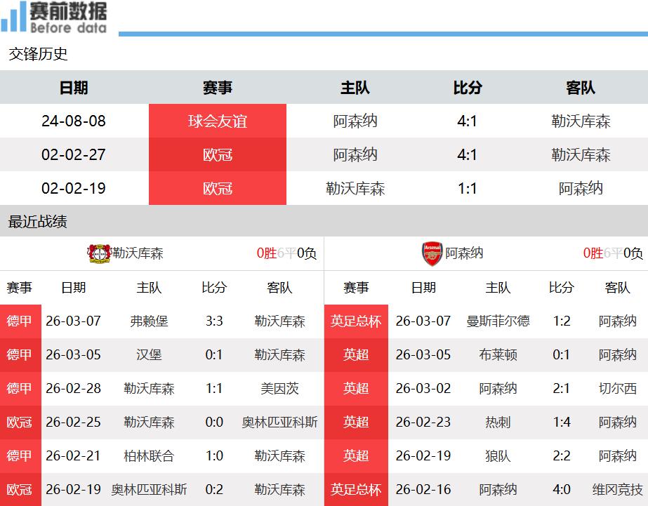 北京时间3月12日凌晨01:45,欧冠1/8决赛首回合比赛,勒沃库森主场迎战阿森纳。