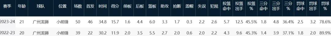崔永熙在广州队效力两年,菜鸟赛季场均11.9分5.5篮板2.7助攻2抢断,投篮命中率45.3%;第二年场均15.7分6篮板3.3助攻1.7抢断,投篮命中率提升至45.5%。