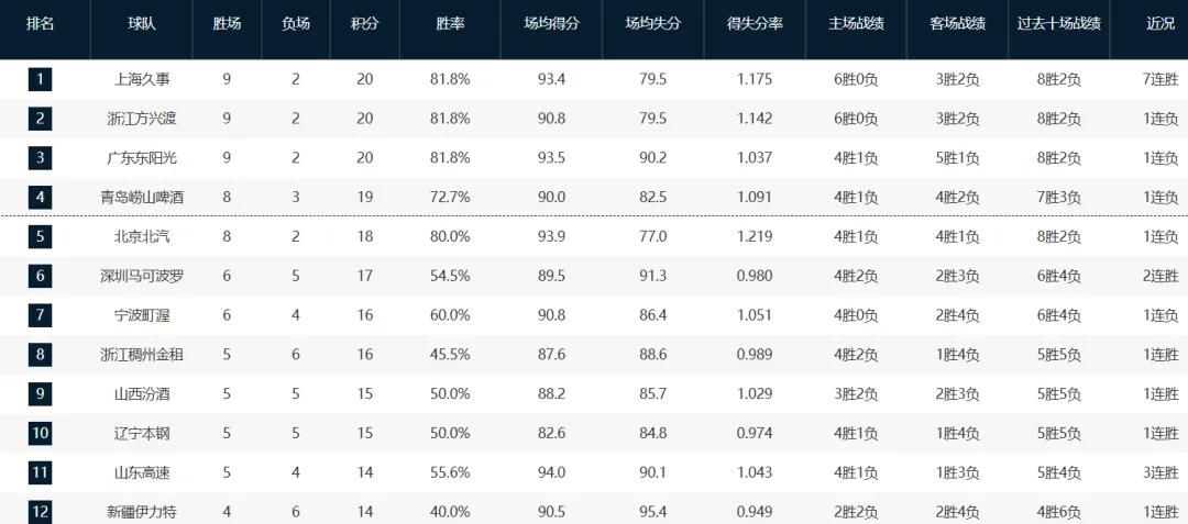 本赛季至今,广东队战绩为9胜2负,排名联盟第三,浙江队则以5胜6负排在第八。