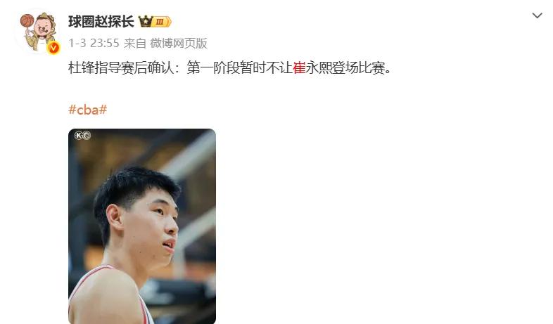 本赛季崔永熙决定回归CBA,并被广州队交易至广东队,但他的伤势尚未完全康复,预计要到今年三月中旬才能复出。