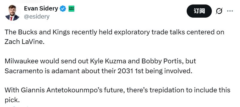 在最初的交易方案中,雄鹿准备将凯尔·库兹马和博比·波蒂斯交易给国王。不过据悉,国王态度坚决,要求雄鹿必须附加2031年的首轮选秀权。考虑到字母哥未来去向尚不确定,雄鹿对放弃该选秀权持谨慎态度。