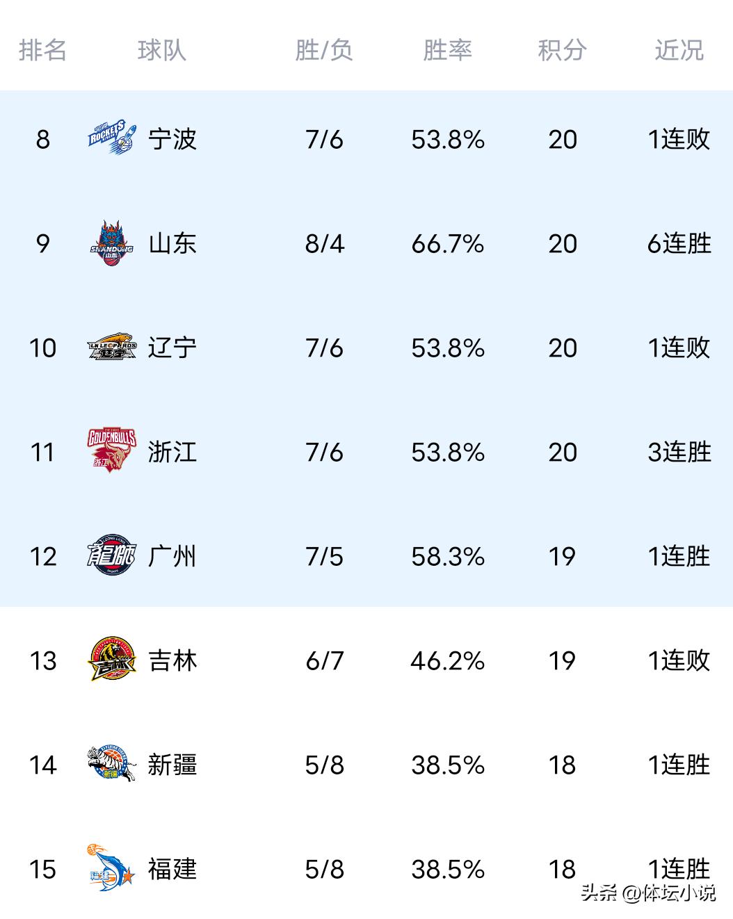 北京时间1月12日,CBA常规赛第13轮比赛开打,昨晚多场比赛结束,吉林一直落后以74-82不敌青岛,辽宁溃败以78-108惨输广东,山东末节爆发以89-76击败同曦,上海96-81战胜山西,最新积分榜更新,上海九连胜稳固位置,广东两连胜排名第三,青岛位列第五,辽宁排在第十!