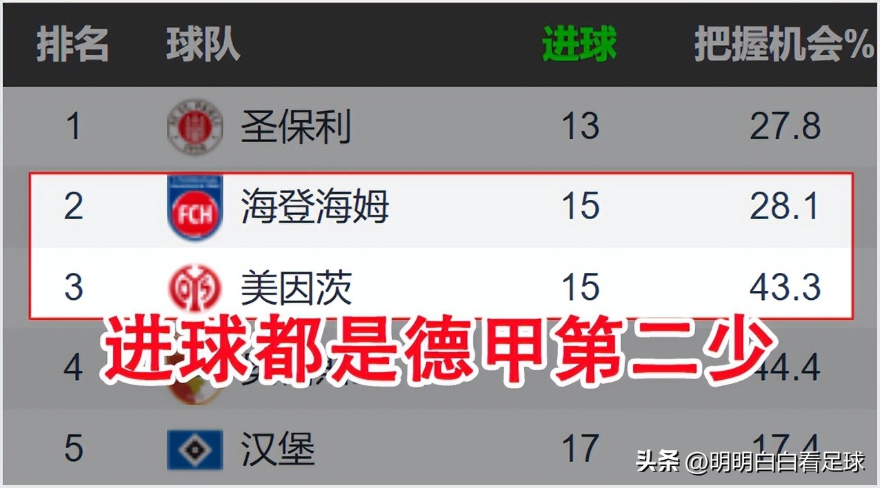 但海登海姆的进攻其实和美因茨一样糟糕,进球也是德甲第二少。