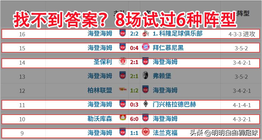自11月以来,海登海姆共踢了8场比赛,主帅施密特尝试了6种不同阵型,但都没见效果。
