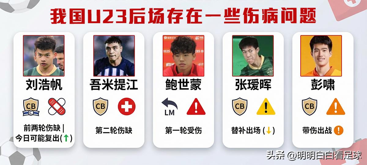 队长刘浩帆前两轮因伤缺阵,吾米提江上一场受伤退场,鲍世蒙第一轮受伤,张瑷晖上一场刚刚康复替补登场,彭啸则是在第一轮带伤上阵;