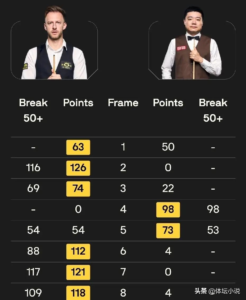 比赛开始后,双方陷入胶着,特鲁姆普以63-50逆转先拔头筹。随后特鲁姆普手感爆发,连续打出116分和69分两杆制胜,迅速拉开比分至3-0。第四局丁俊晖凭借单杆98分止住颓势,第五局他又以73-54完成精彩逆转,将比分追至2-3。第六局特鲁姆普白球失误,但丁俊晖也未能把握机会,特鲁姆普上手后单杆88分拿下此局,击碎了丁俊晖的信心。随后丁俊晖崩盘,特鲁姆普气势如虹,连续两杆破百,最终以6-2大胜!